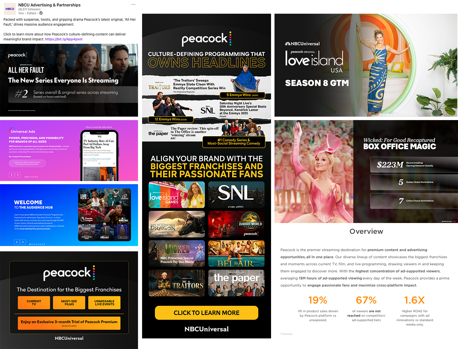 Decks, one-sheets, and sizzles highlighting Peacock, programming, and brand impact.